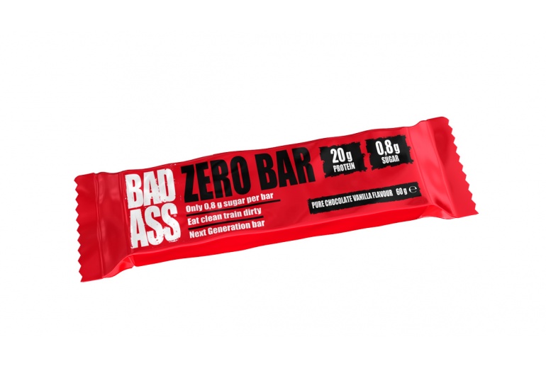 BAD ASS Zero BAR je vynikající proteinová tyčinka, kterou můžete završit svůj poctivý trénink a to bez jakýchkoli výčitek svědomí. Obsahuje vysoký podíl bílkovin a vlákniny s minimálním množstvím cukrů a tuků. Během výrobního procesu nebyl k ingrediencím dodán žádný cukr navíc a tak má tyčinka jen cukry obsažené přirozeně v hodnotě 0,8g na 60g váhy tyčinky. Příchutě tyčinek mohou směle soutěžit s nejchutnějšími tyčinkami na trhu. Když chcete něco sladkého a zdravého, neváhejte a sáhněte po BAD ASS Zero BAR!